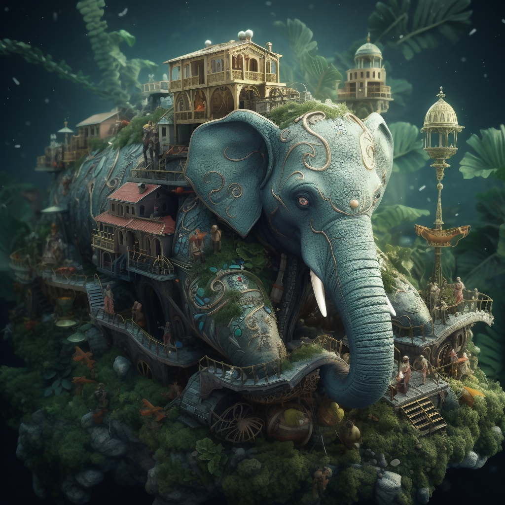 Tags: Fantasy, AI art, Surreal, Elephant, Architecture, Nature, Dreamscape, Digital painting, Whimsical, Village