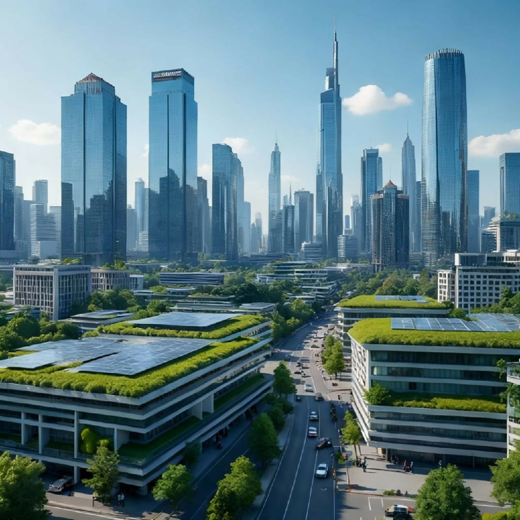 A definitive portrait of sustainable global power. This exclusive artwork captures The Emerald Skyline, where architectural dominance is seamlessly integrated with pioneering green technology. It is the essential acquisition for the collector who commands the future of wealth, efficiency, and ecological superiority.