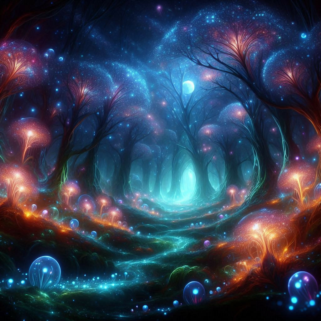 The vibrant blues, purples, and greens of the bioluminescent plants light up the surrounding darkness, creating an atmosphere that feels both tranquil and awe-inspiring. This masterpiece captures the essence of fantasy, where the boundaries between reality and dream blur, and anything seems possible.