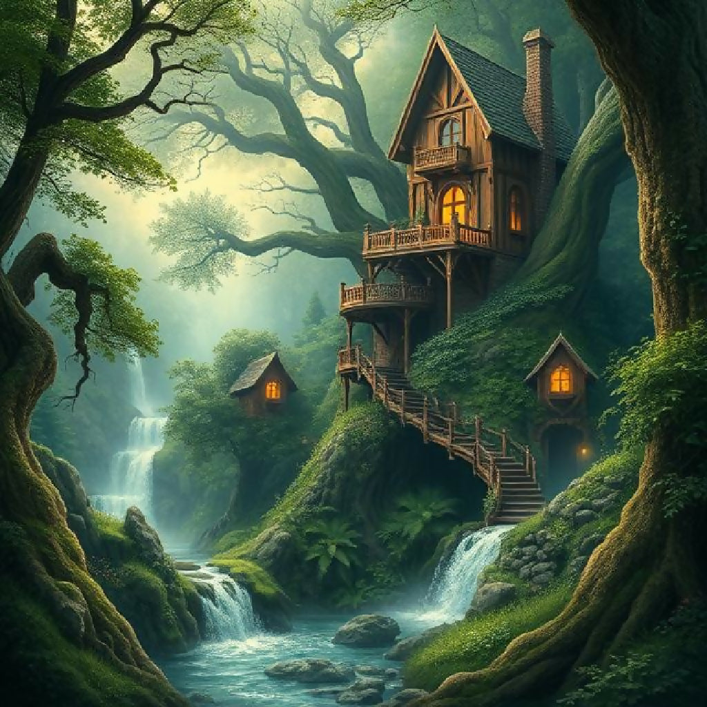 This whimsical and detailed fantasy artwork depicts a magical forest scene centered around an elaborate treehouse. A charming, multi-story wooden house with illuminated windows is nestled high within the colossal branches of an ancient, gnarled tree. Below, a winding river with multiple waterfalls cascades through a lush, green landscape. Smaller, equally enchanting dwellings are built into the rocky terrain alongside the river, connected by wooden stairs and pathways. The entire scene is bathed in a soft, ethereal light, suggesting a hidden, tranquil realm teeming with natural beauty and wonder.