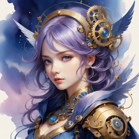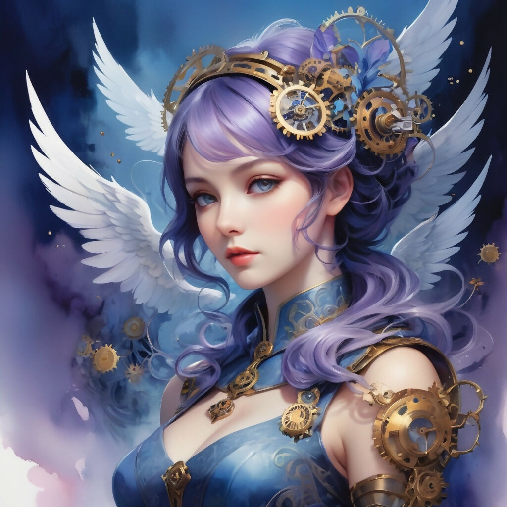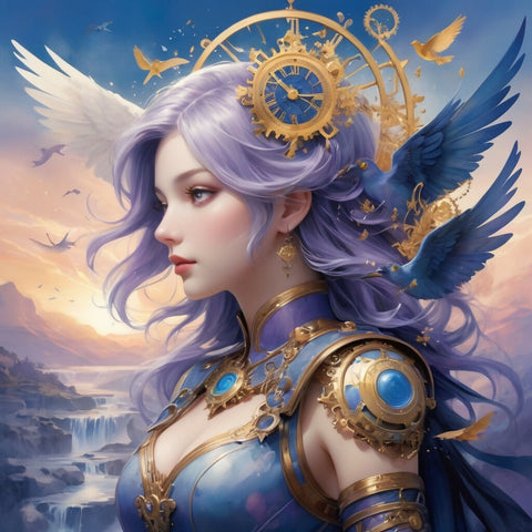Above, a flock of ethereal birds, their wings shaped like clock faces, takes flight against a twilight sky, fading from deep indigo to warm amber. The soft, blended washes of watercolor create an ethereal dreamscape, while fine ink details add contrast to the intricate, mechanical elements. Soft gradients of lavender, cerulean, and rose mist through the background, enhancing the painting’s whimsical yet mysterious aura.