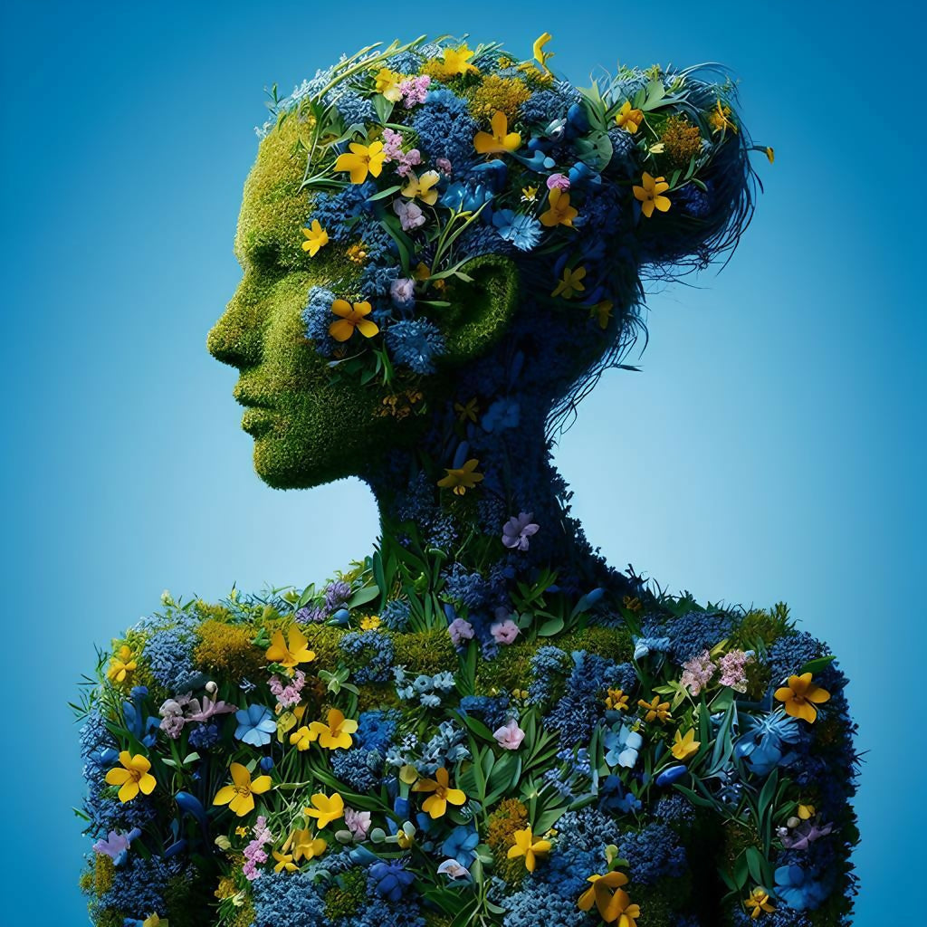 Discover the enchanting beauty of nature and femininity in this AI-generated artwork. A graceful female figure emerges from vibrant flowers and soft grass, symbolizing harmony, renewal, and the deep connection between woman and Earth. A poetic vision of organic elegance.
