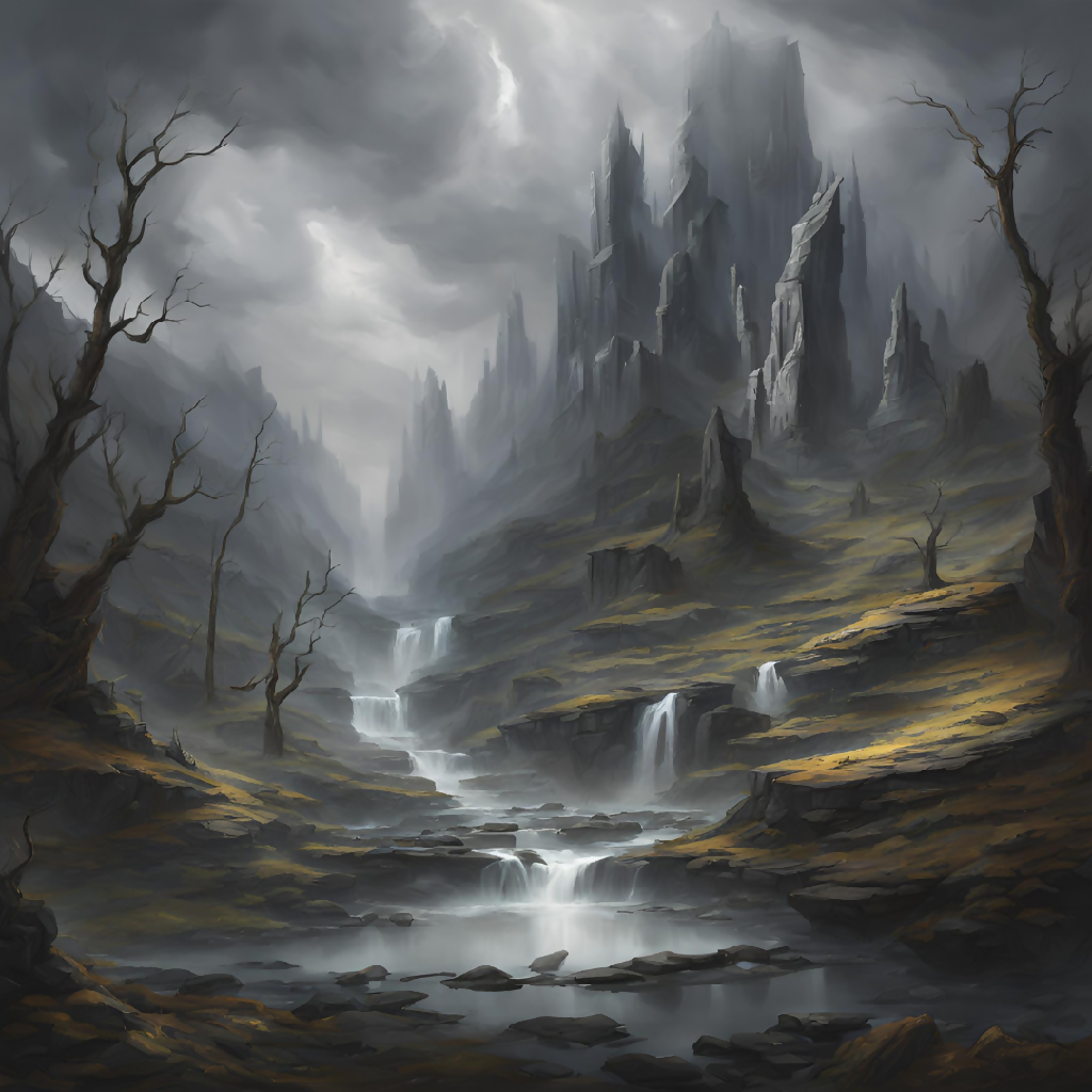 This piece is in a dark fantasy landscape art style, blending elements of romanticism and realism with a moody, atmospheric touch. The dramatic lighting, towering jagged mountains, misty clouds, and cascading waterfalls create an ominous yet breathtaking scene, reminiscent of concept art for fantasy worlds or epic storytelling.