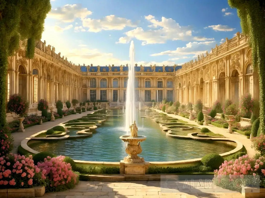 The painting conveys the grandeur and beauty of the Versailles gardens with manicured lawns, richly decorated fountains and colorful flower beds. The use of light and color creates a feeling of elegance and grandeur.