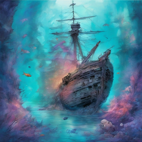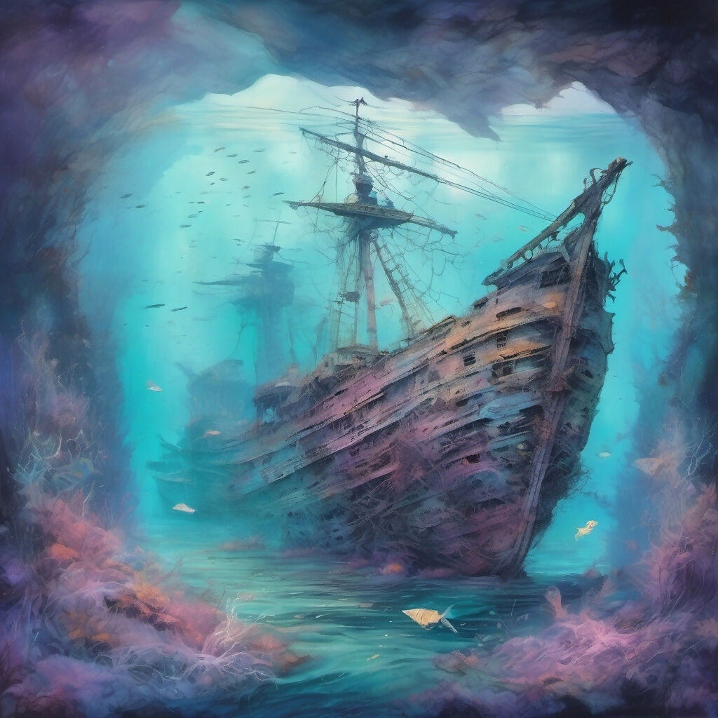 A haunting yet beautiful watercolor painting of a ghostly shipwreck resting silently on the ocean floor. The skeletal remains of the ship, encrusted with coral and sea life, glow softly in shades of deep teal, midnight blue, and ethereal aqua. Swirling currents carry schools of bioluminescent fish in electric blues and purples, illuminating the wreckage with a surreal glow.