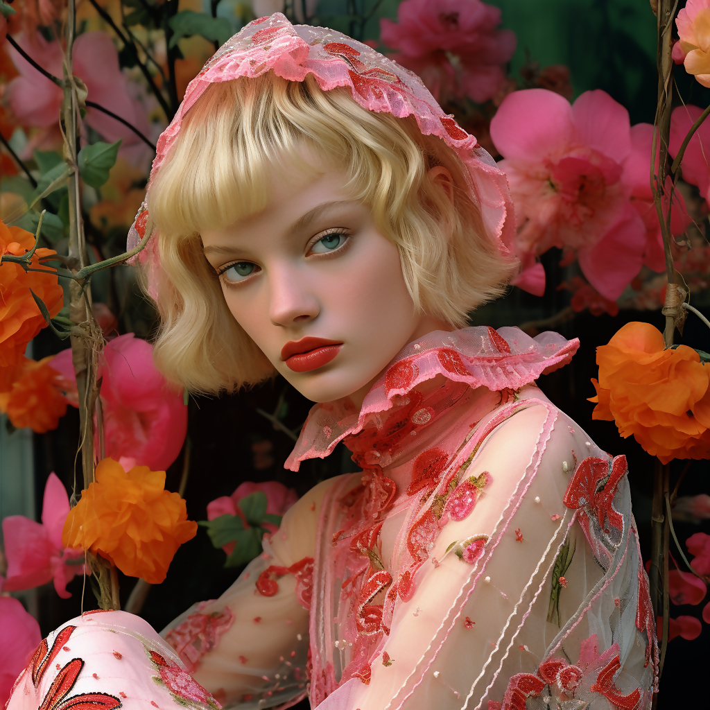 Style: Romantic editorial, botanical surrealism, ornamental femininity, nature-infused fashion fantasy