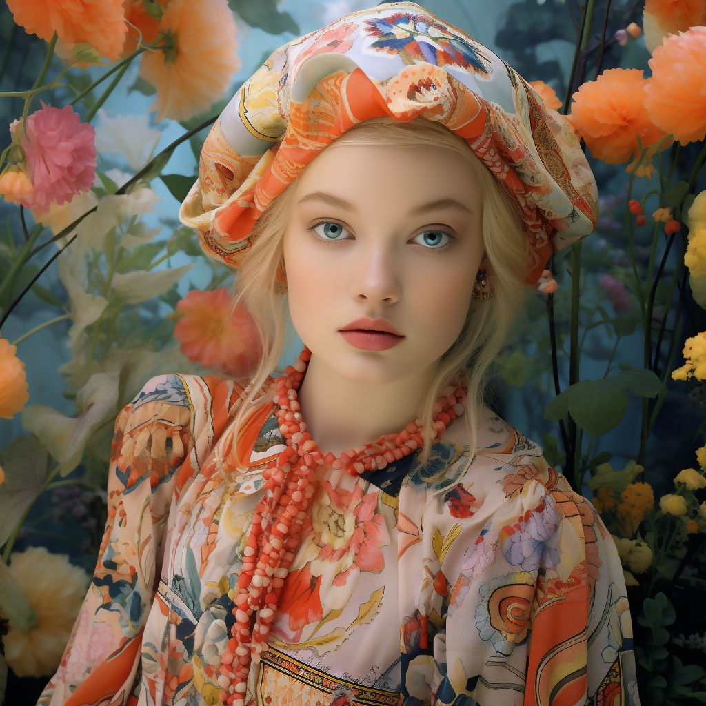Tags: naira, whispering garden, floral muse, embroidered elegance, coral beads, botanical portrait, editorial fantasy, ornamental serenity