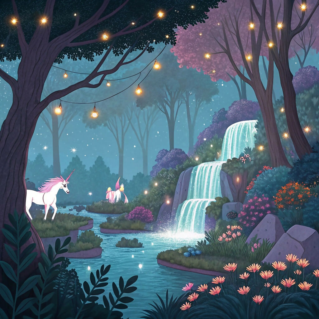 The image features a whimsical scene with a waterfall surrounded by lush greenery, complemented by a mythical unicorn. The setting suggests a fantasy theme, blending natural elements with magical imagery. The style appears to be influenced by anime aesthetics.