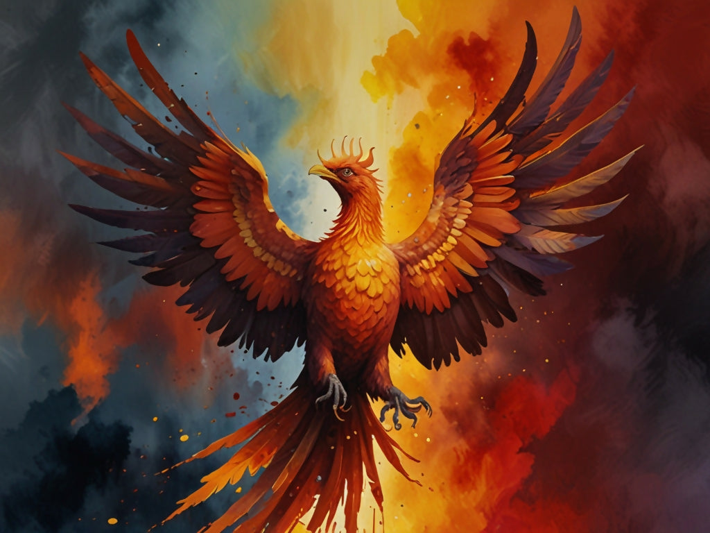 A watercolor painting of a majestic golden phoenix soaring over a molten volcanic landscape, its luminous feathers shimmering in cadmium yellow, quinacridone gold, and ochre, radiating divine energy. The sky burns deep red, with swirling ash clouds in Payne’s gray and crimson, while jagged volcanic rock and flowing lava in burnt umber, pyrrole red, and vermilion create an intense, fiery scene. Use wet-on-wet washes for the dramatic sky, layered glazing for the phoenix’s glowing plumage, and salt or splattering techniques for the cracked magma textures. Soft pigment lifting around the phoenix enhances its radiant aura, symbolizing rebirth and resilience. The final painting should feel powerful, ethereal, and mythological, with the fluidity of watercolor capturing the motion of fire, smoke, and celestial energy.