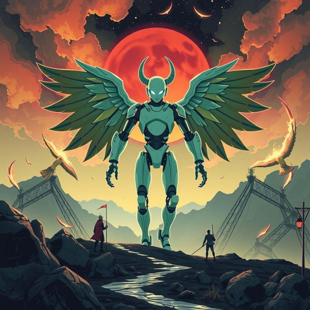 A towering robotic figure with angelic wings and horns stands guard on a desolate landscape under a blood-red moon. Two figures approach cautiously, seemingly dwarfed by the mechanical sentinel and the surreal environment.