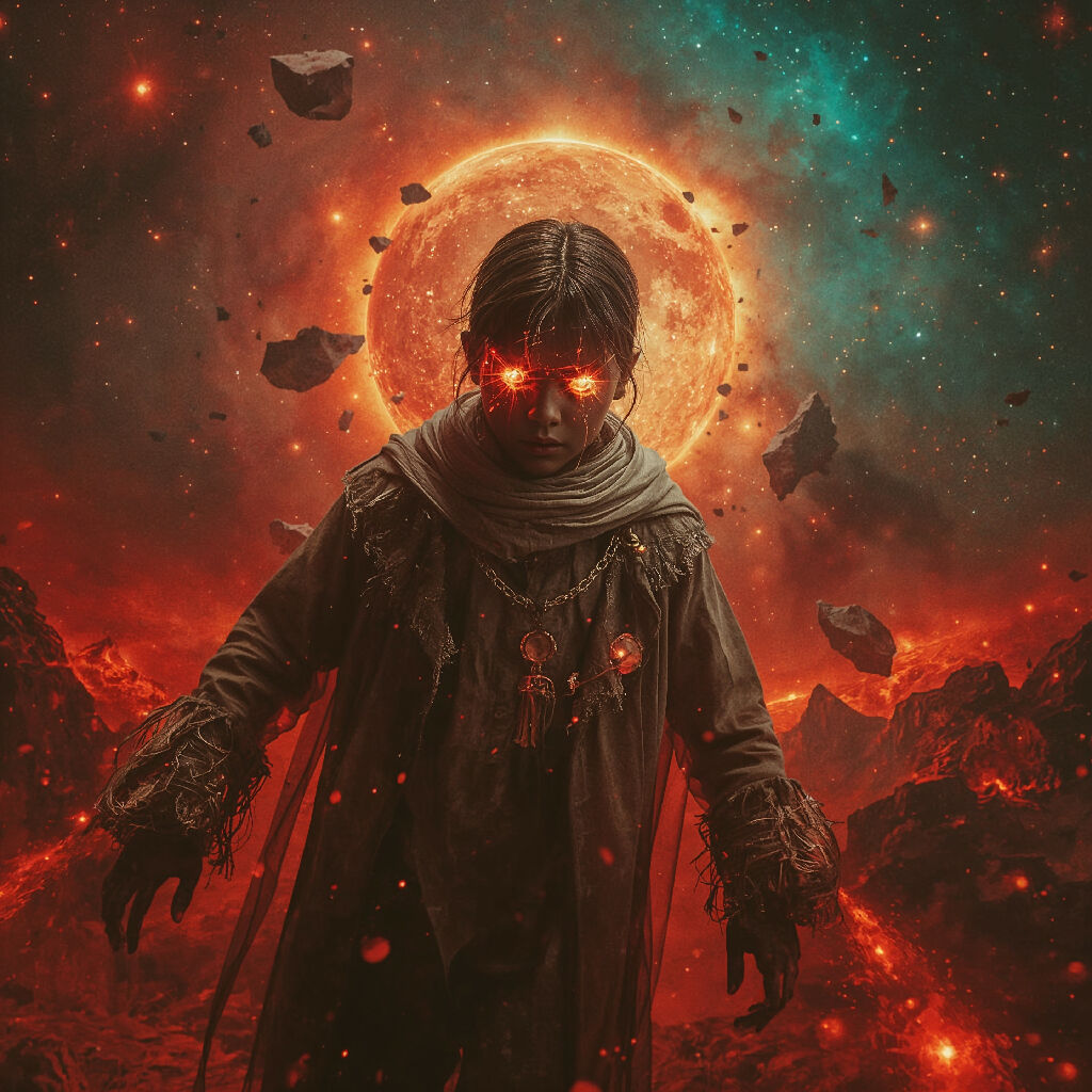 A solitary figure emerges from apocalyptic terrain, their form shrouded in tattered robes that speak to pilgrimage through desolation. Crimson light emanates from their eyes, suggesting prophetic vision or divine affliction, while a luminous celestial body dominates the background, perhaps a dying sun or newborn star. Floating debris and fractured stone populate the cosmic landscape, creating a tension between destruction and genesis. The composition balances earthly suffering with celestial transcendence, the figure serving as a bridge between mortal experience and cosmic revelation. Rich oranges and deep crimsons saturate the scene, evoking both hellfire and sunrise, suggesting that within apocalypse lies the seed of renewal.