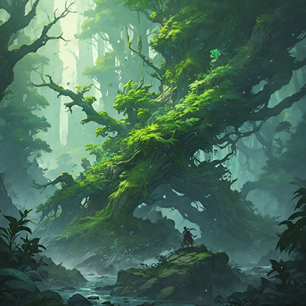 This artwork depicts a lush, ancient forest teeming with life. A lone traveler stands in awe before a colossal, ancient tree, its roots reaching deep into the earth and its branches stretching towards the sky. The scene is bathed in a soft, ethereal light, creating a sense of mystery and wonder.