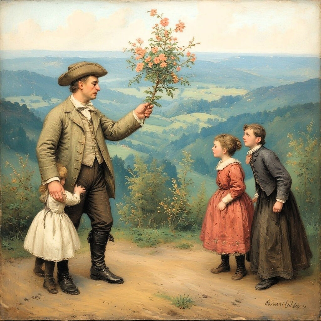 A central figure, a man clad in a hat and jacket, stands prominently. He holds a delicate branch adorned with vibrant pink blossoms, suggesting a connection to the season's bloom or perhaps a thoughtful gesture.