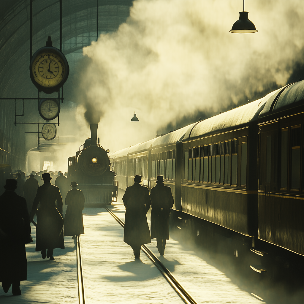 This AI-generated scene captures a bustling winter train station where shadows stretch long, clocks hang heavy, and the air is thick with steam. Figures move with purpose beneath the vaulted ceiling, their silhouettes sharpened by morning light. A moment alive with anticipation, nostalgia, and cinematic elegance.