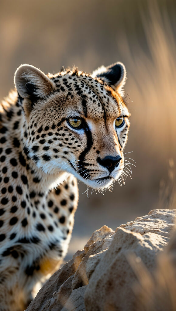 Step into the heart of the wild with this breathtaking AI-generated artwork featuring a fierce cheetah scanning the horizon for its prey. With its sleek, spotted coat, piercing gaze, and poised stance, this masterpiece captures the raw intensity, speed, and elegance of nature’s fastest predator. The golden savannah stretches endlessly behind, setting the perfect stage for this moment of anticipation and primal instinct.