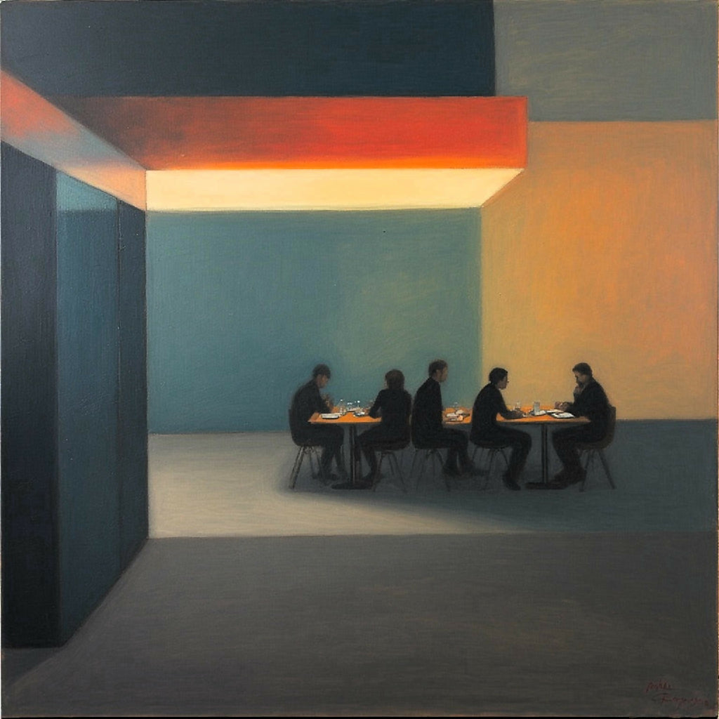 This Ai painting captures a scene of five figures gathered around two tables within a minimalist, geometrically structured interior. A striking, warm light source, emanating from a ceiling recess, bathes the central area in a bright yellow and orange glow, creating a dramatic contrast with the surrounding muted blues, greens, and dark grays of the walls and floor.