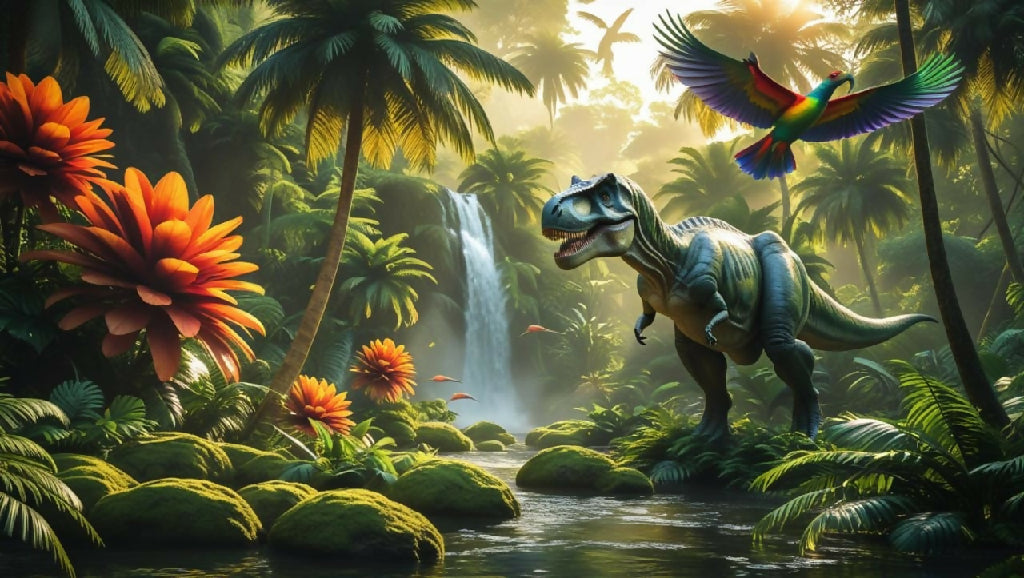 A breathtaking prehistoric jungle scene filled with lush green trees, vibrant tropical flowers, and crystal-clear waterfalls. A majestic dinosaur, detailed and realistic, stands among the dense foliage while colorful exotic birds soar in the sky. Soft golden sunlight filters through the canopy, mist drifting between the trees, creating a magical and adventurous atmosphere. Ultra-realistic, highly detailed, cinematic lighting, 8K resolution.