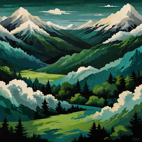 The impressive landscape of mountains, trees, and sky.  In the style of Tokio Aoyama and Satoru Takizawa.  Colors of greens, whites, teal.   Impressive clouds.  Whimsical strokes