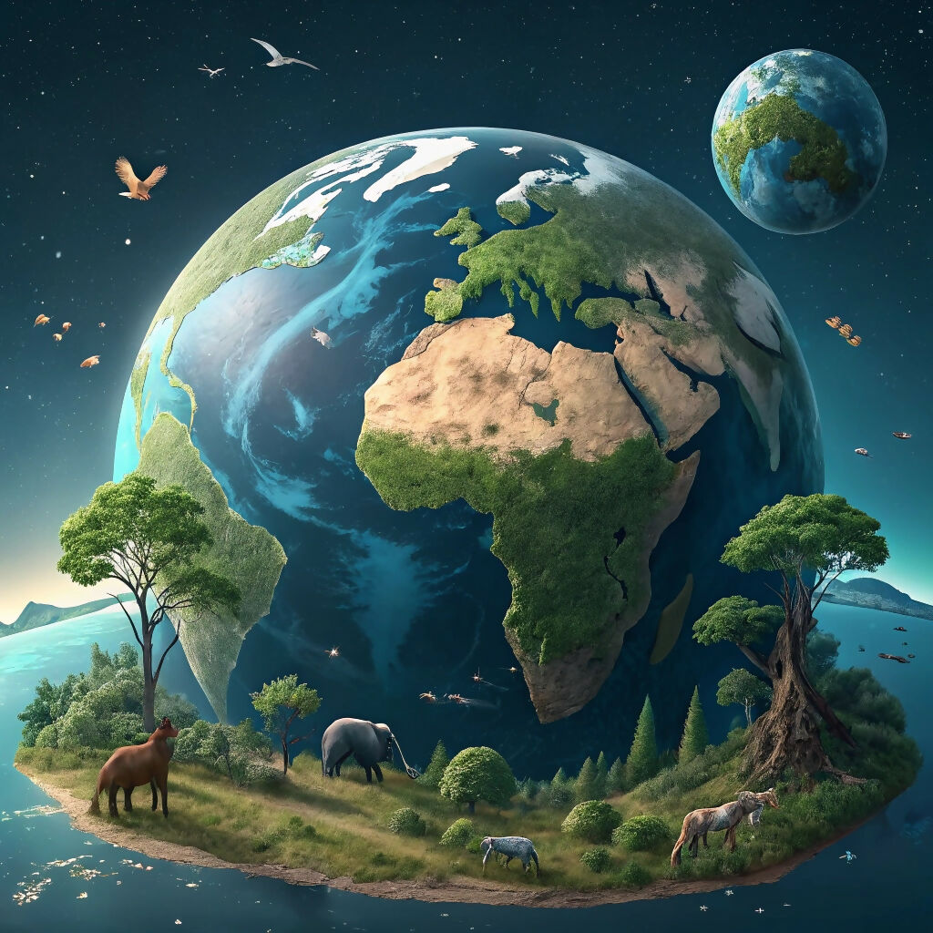 The overall impression is one of a vibrant and diverse ecosystem, highlighting the Earth's beauty and wildlife. The artwork is rendered with a high degree of detail, including realistic texture in the landscape.  Background shows a starry night sky.