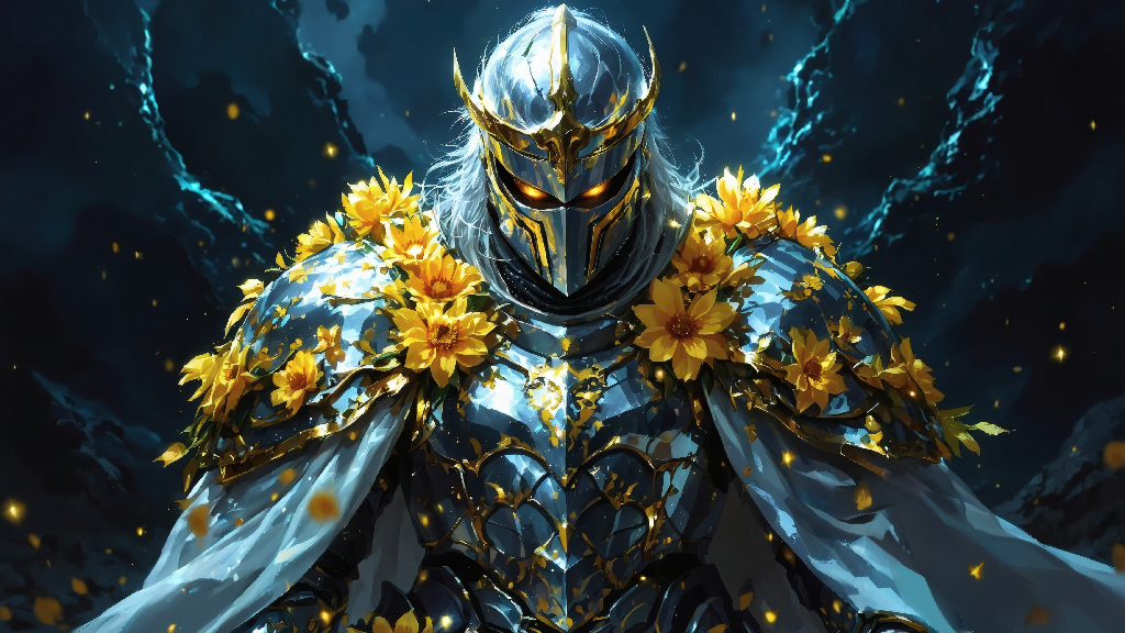 Behind that golden-trimmed helmet, no one knew if flesh or phantom dwelled. They called the knight Aurelian, not for any given name but for the sunburst flowers that sprouted from armor that should bear only battle scars. The blooms came after the Battle of Whisperfall, where lightning split the sky and strange magic poured through the rifts. Those who witnessed Aurelian stride from that shadowed valley swore the knight's eyes now burned like twin harvest moons behind the visor; watchful, ancient, changed. The flowers never wilted, even as seasons turned, and where Aurelian walked, impossible golden petals fell upon the path. Some said a curse, others a blessing, but all agreed: whatever power claimed the knight that night required payment still uncollected.