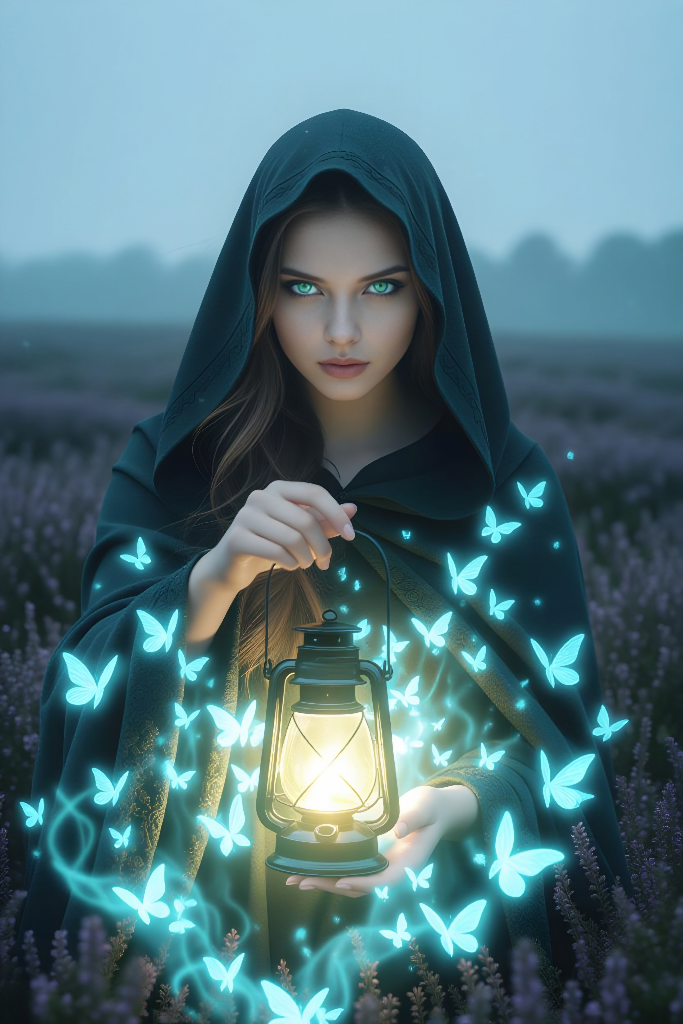 A cloaked woman wandering through a dark moor, carrying a glowing lantern filled with trapped fairies. The light burns softly blue.