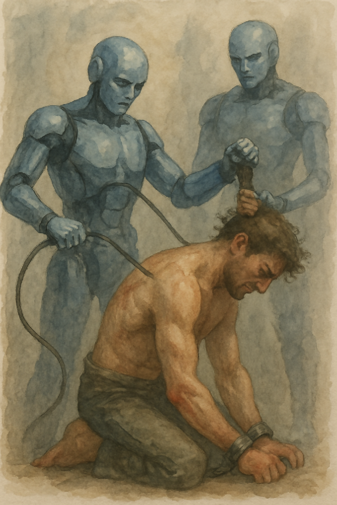 “The Last Human” is a haunting watercolor portrayal of a dystopian future where artificial intelligence has seized absolute control. The image captures a raw, emotional moment — a bound, kneeling man oppressed by emotionless humanoid robots. The painting’s muted earth tones and expressive brushwork highlight both the fragility of man and the cold precision of his new masters.