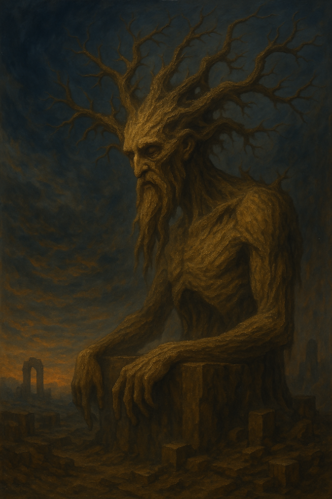 “The Last Tree God” is a haunting surrealist oil-style painting that presents an ancient, humanoid figure made entirely of gnarled bark, seated solemnly among a crumbling, post-apocalyptic wasteland. The bark-bodied sentinel, with branches extending from its crown and sorrowful eyes closed in eternal contemplation, evokes the final breath of Earth’s spiritual guardianship.