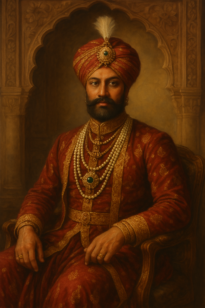 Step into the grandeur of India’s regal heritage with “The Maharaja’s Dignity,” a masterfully rendered oil-style painting that captures the commanding presence of a royal Indian king. Seated against a majestic carved sandstone arch, the Maharaja is dressed in an opulent red velvet sherwani richly embroidered with gold motifs, adorned with pearl necklaces, gemstone ornaments, and a striking turban. His calm yet authoritative gaze symbolizes leadership, tradition, and pride. Every brushstroke reveals exceptional detail, ideal for collectors and aficionados of classical Indian art.