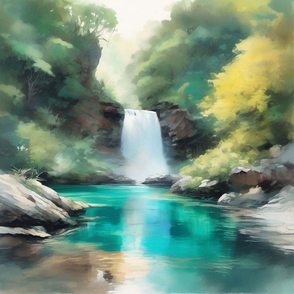 powerful waterfall tumbling down from towering cliffs into a serene turquoise pool below. The force of the water creates a misty veil that catches the sunlight, diffusing soft glows across the scene. Surrounding the waterfall, lush green foliage—vibrant moss, ferns, and overhanging branches—frames the scene, adding depth and a sense of untouched nature. The painting should convey both the raw power of water and the tranquility of its surroundings.