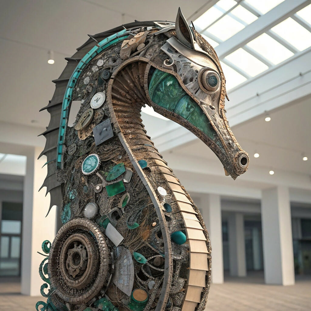 A stunning fusion of ocean myth and industrial mastery. This exclusive sculpture, The Mechanical Leviathan, is an intricate, life-size seahorse crafted from complex gears, metal fragments, and reclaimed jade accents. It is a profound acquisition for the visionary who values sophistication, sustainability, and the transformation of found history into high art.