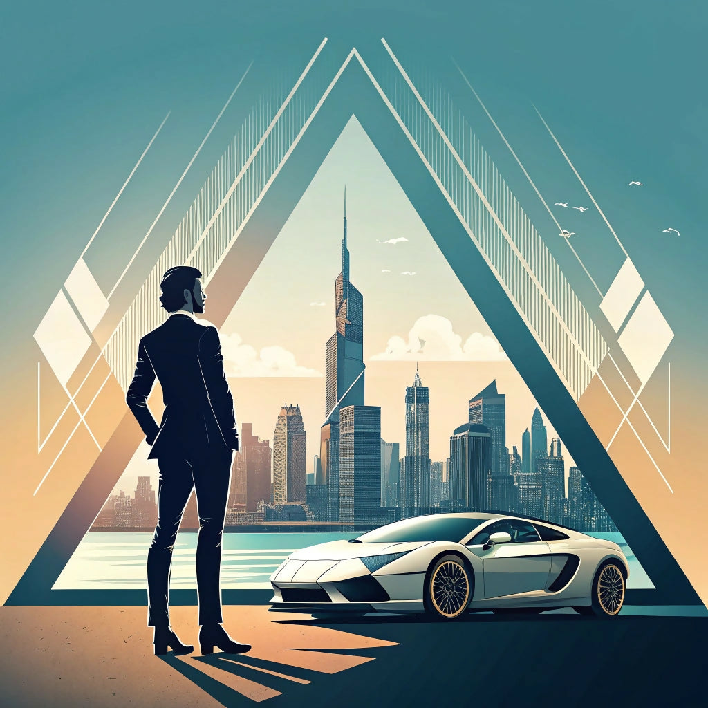 A man is standing next to a sports car, which is positioned outdoors. The background features a skyscraper, and the scene highlights various elements such as clothing and footwear. This setting emphasizes the combination of luxury vehicle aesthetics with an urban environment.