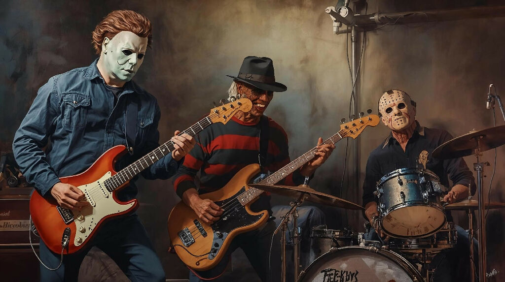 Creepy painting of an 80's Movie Monster power trio consisting of Michael Myers, Freddy Krueger and Jason Vorhees.