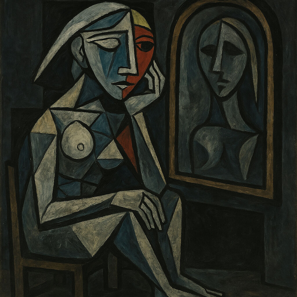 I have gone for the bleak and unsettling emotion that sometimes when we look in the mirror, we don't always like whose looing back.