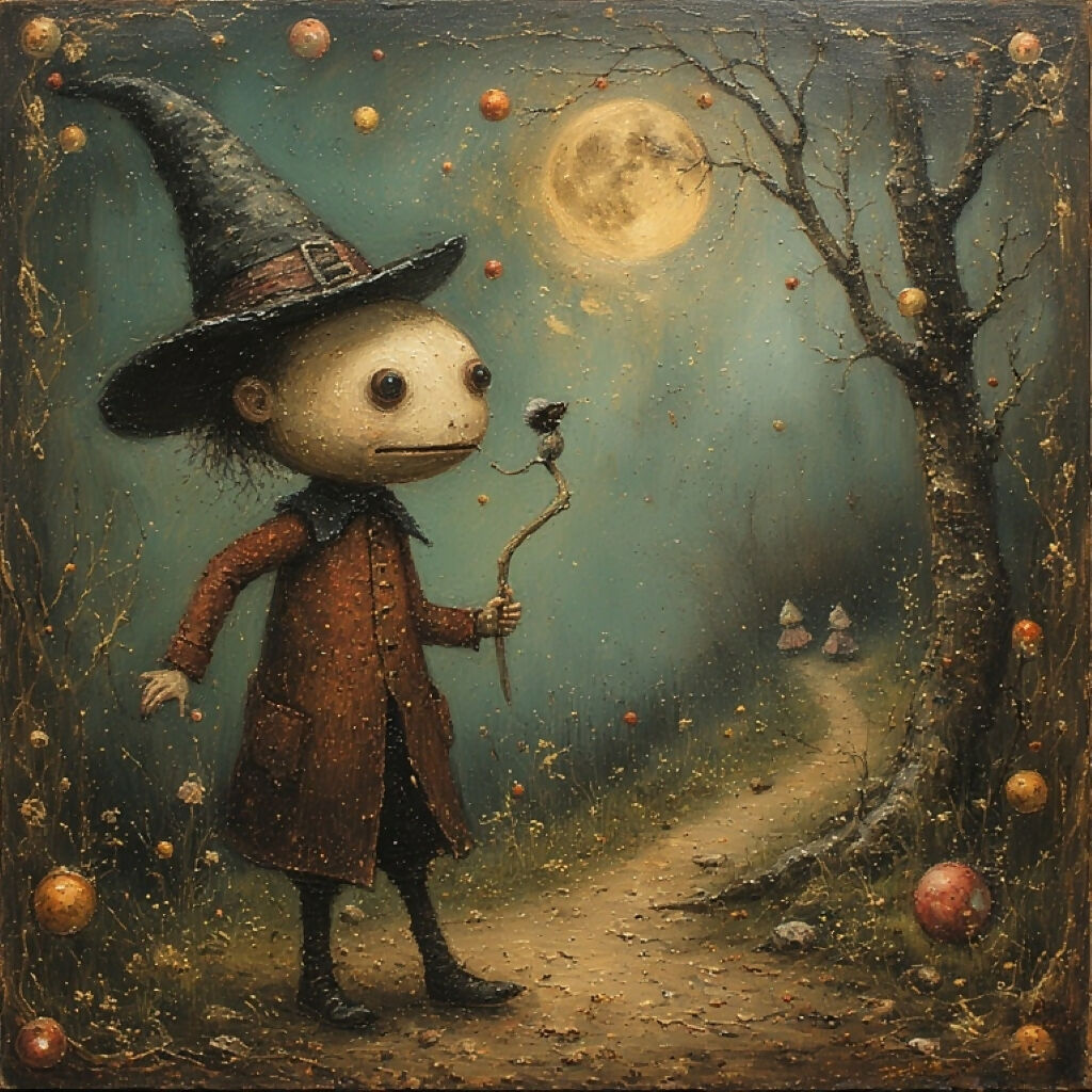 This AI-generated image conjures a scene of whimsical enchantment, tinged with a delightful eeriness. At its heart stands a childlike figure, its large, round eyes and wide mouth hinting at a mixture of innocence and mystery. The figure is adorned in a classic pointed witch's hat and a long, textured coat, suggesting a connection to the magical or the arcane.