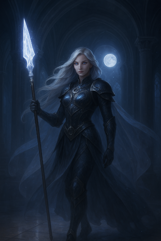 An ultra-detailed 8K fantasy digital painting of a mystical Valkyrie standing in a moonlit cathedral. She wears shimmering obsidian and silver armor engraved with glowing runes, with silver hair flowing like starlight. Holding a radiant spear infused with celestial power, her violet eyes glow with divine strength. Perfect for fantasy posters, book covers, RPG character art, and collectible wall prints.