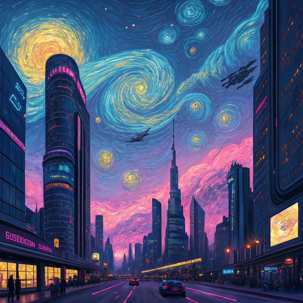 A stunning fusion of classic genius and future wealth. This exclusive artwork merges the vibrant, swirling energy of a Van Gogh masterpiece with a dazzling neon-lit cyberpunk metropolis. It is a coveted, high-energy statement piece for the visionary collector who defines the cutting edge of culture.