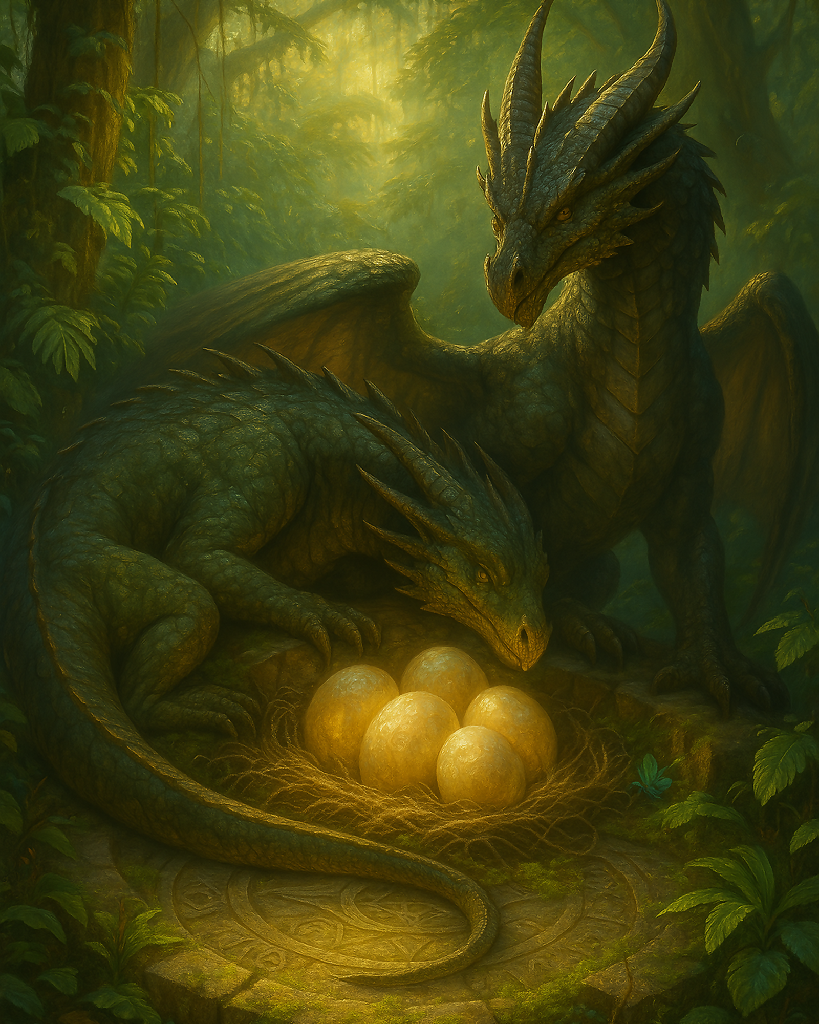 Beneath the ancient canopy of the Amazon rainforest, two dragons guard a sacred nest—the beginning of a lineage, the breath of a legacy. The Nest Beyond Time captures a moment of stillness and protection, where myth and instinct meet. The mother coils gently around her glowing eggs, while the father stands watchful beside her, fierce and unwavering.