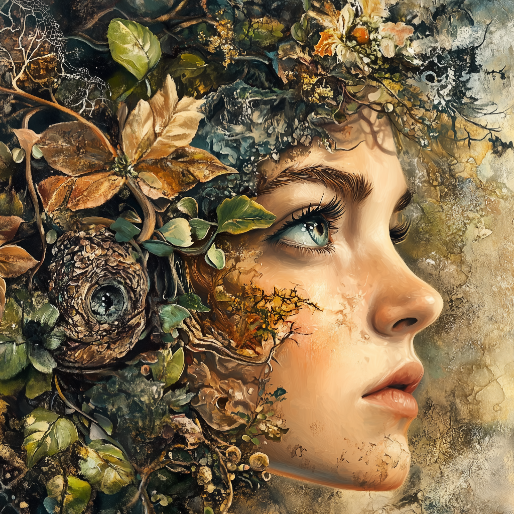This highly detailed AI artwork captures a woman's profile as she merges with the forest—leaves, bark, vines, and a hidden nest swirl around her like growing thoughts. Her skin bears textures of earth, her eye reflects clarity and ancient wonder. It's a portrait of becoming—both wild and deeply human.
