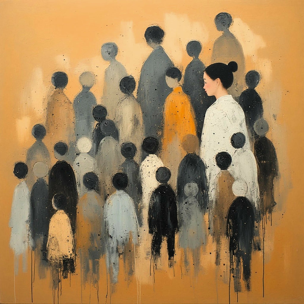 An Ai artwork portraying a moment of quiet contemplation. A woman with a distinct, calm profile, dressed in white, stands out from a dense gathering of abstract, faceless figures. The crowd, rendered in shades of grey, black, and muted earth tones, blends into the warm, textured orange backdrop, creating a sense of anonymity. It portrays the experience of being both part of and apart from the world, highlighting the power of individual thought amidst a sea of humanity.