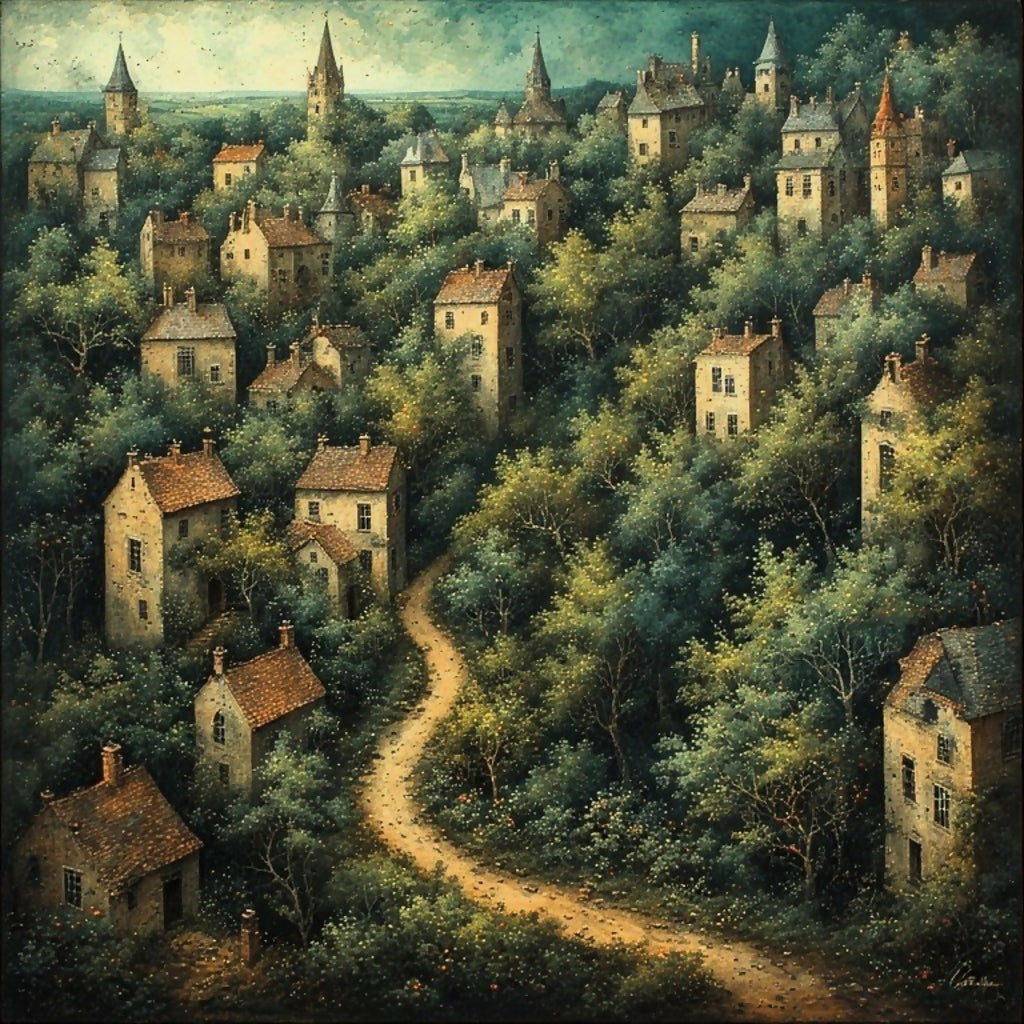 Peeking above the treeline in the background, church spires and other taller structures rise, hinting at a larger settlement beyond this serene hamlet. The entire vista evokes a feeling of peace, a touch of mysticism , and possesses a painterly quality , where the interplay of light and shadow creates a dreamlike atmosphere.