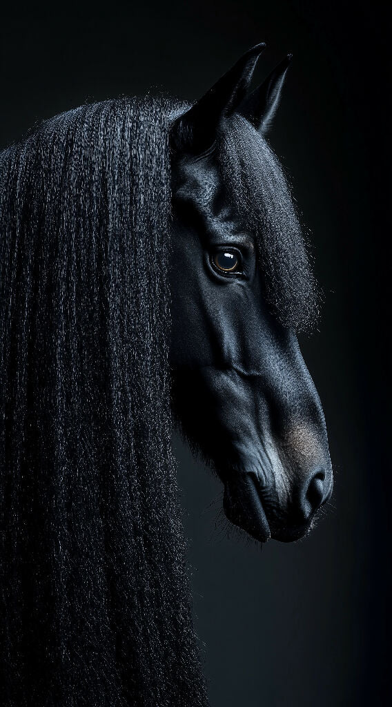 Set against a deep, dark backdrop, the artwork focuses entirely on the magnificent creature. The portrait is dominated by a cascading black mane, rendered with such incredible detail it feels like liquid silk against the smooth, dark coat. But the true heart of this piece is the eye—a warm, soulful gaze that shines with intelligence and gentleness.