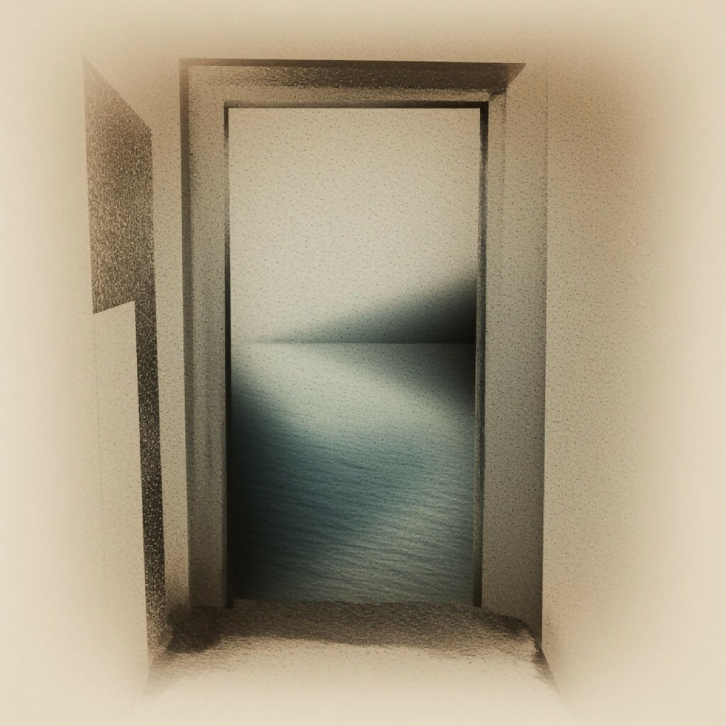 This image presents an abstract interpretation of an open doorway, rendered with a captivating textured surface. The interplay of light and shadow is particularly striking, with a diffused, soft illumination creating a palpable sense of depth and an aura of mystery. A gradient of light gracefully transitions into shadow across the composition, drawing the viewer's eye into the unknown space beyond the threshold.