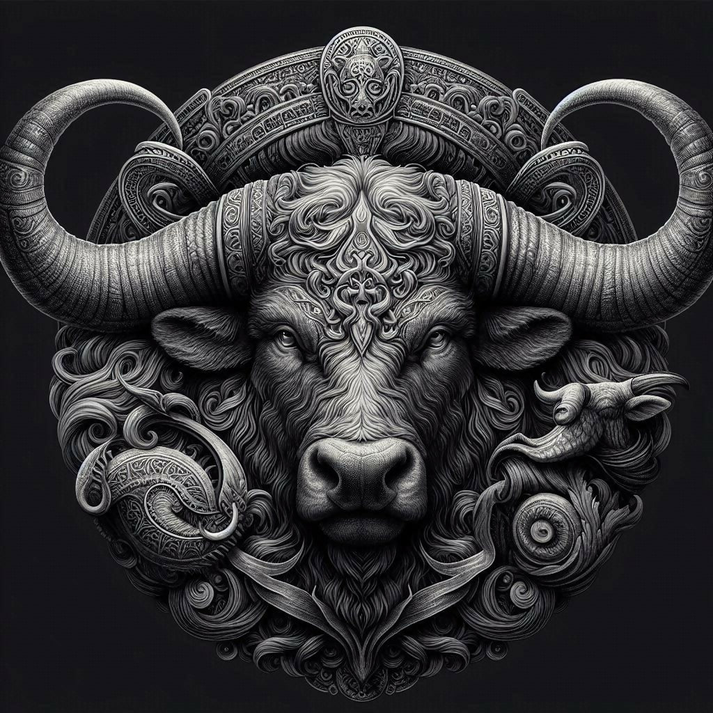 Tags: bull, horns, ornamental, fantasy art, digital illustration, animal symbolism, mythic creature, symmetrical design, bird, swirling patterns, detailed line art, nature-inspired, mystical, stylized animal, strength