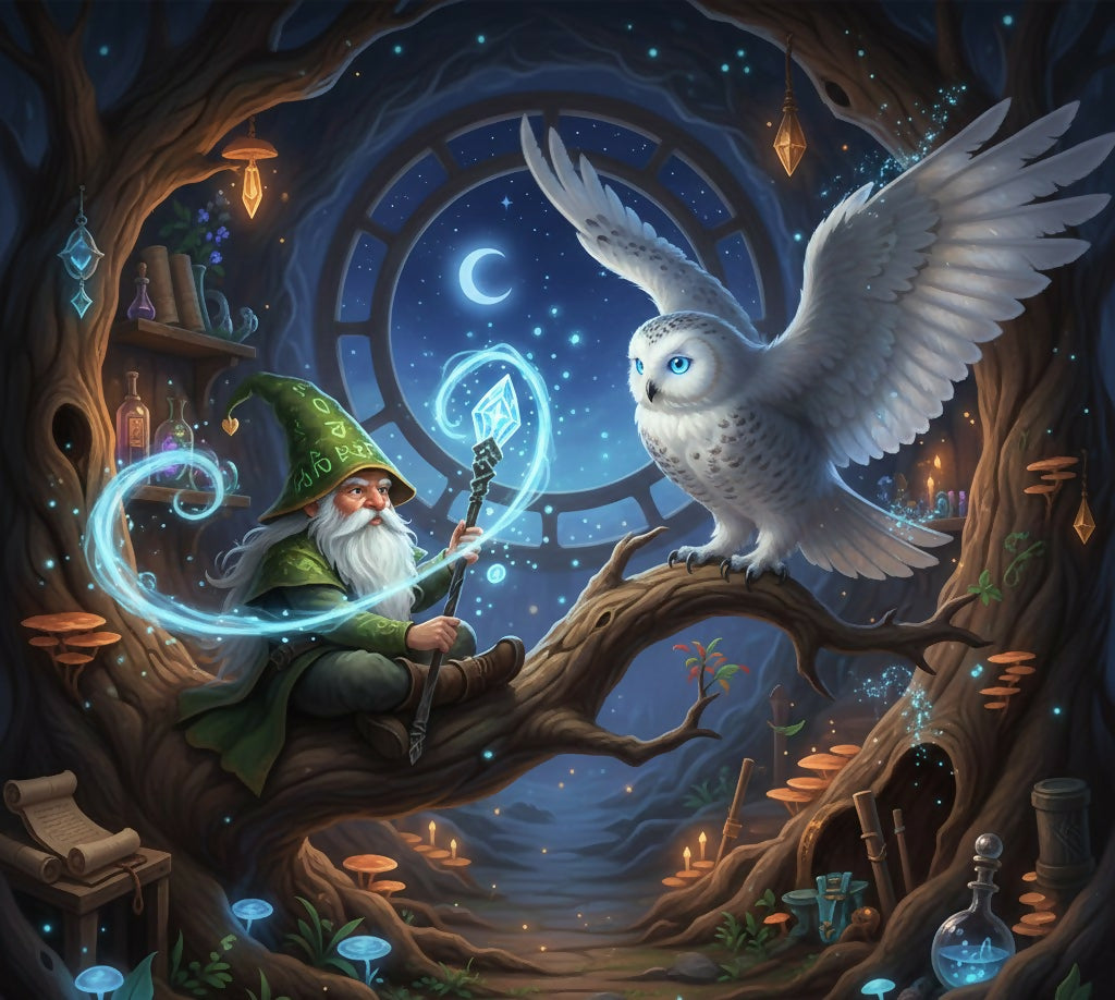 This wise Owl has taken this gnome under his wing to teach the magical craft to save their land. He seems quite pleased at the little ones progress.