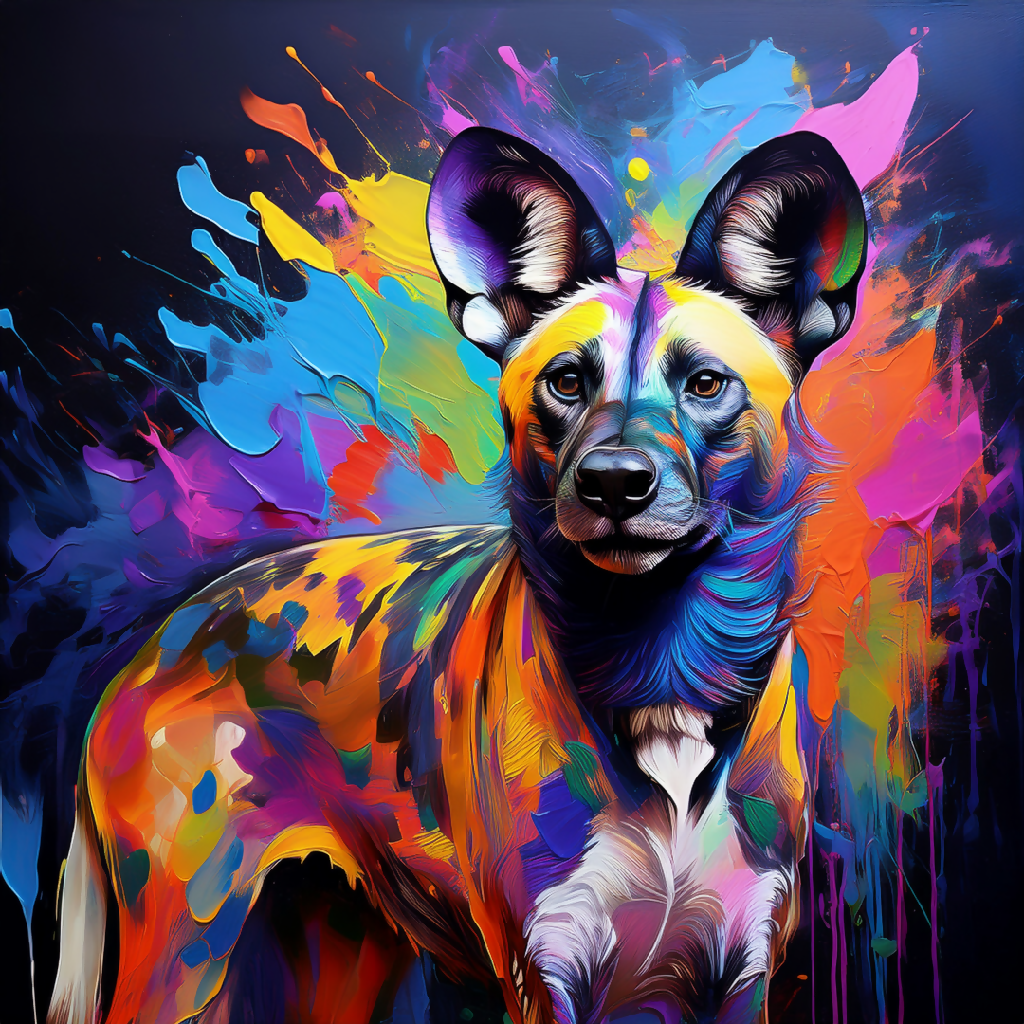 Radiating intensity and elegance, this vibrant portrait of the African wild dog captures the spirit of one of Africa’s most endangered predators. Bursting with electric color and bold brushstrokes, the artwork transforms the animal’s natural camouflage into a celebration of survival, unity, and untamed beauty. Set against a backdrop of explosive splashes, the wild dog's gaze is alert and unwavering, an artistic homage to resilience in the wild and the urgent call to protect what remains.