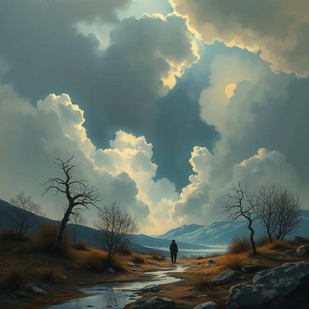 This surreal painting depicts a solitary figure walking along a winding, reflective stream through a barren, rocky landscape. Twisted, leafless trees stand sentinel on either side of the path, and distant mountains frame a serene body of water. Above, a dramatic sky filled with tumultuous, ethereal clouds suggests both foreboding and a glimmer of hope, with rays of light breaking through. The overall mood is one of quiet contemplation and enduring journey.