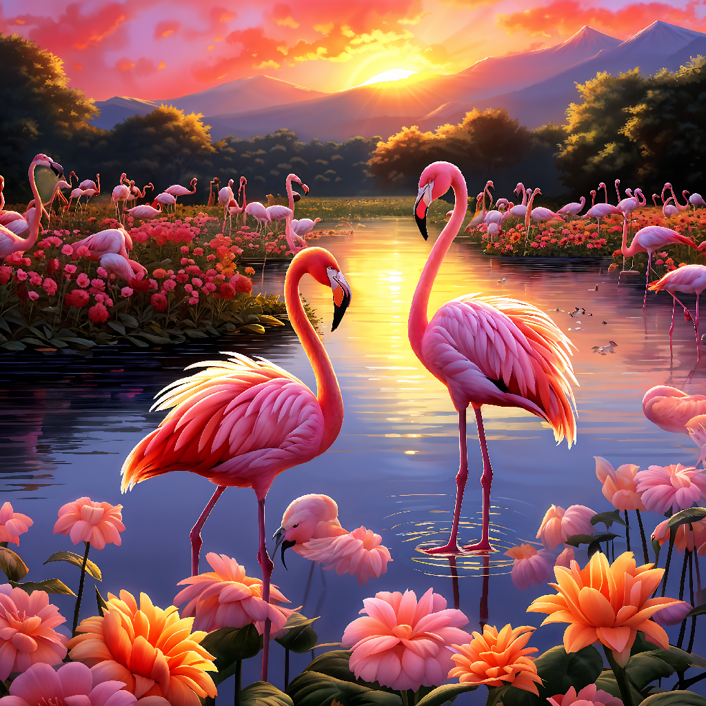 This enchanting digital painting transports you to a tropical paradise. A vibrant sunset bathes the scene in warm hues, casting a golden glow over a lush landscape. Graceful flamingos, their pink plumage glowing like jewels, stand amidst a vibrant array of flowers.The scene is serene and peaceful, inviting you to lose yourself in the beauty of nature. The image is perfect for those who appreciate wildlife art, tropical landscapes, and a touch of the whimsical.