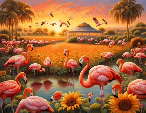 This enchanting digital painting transports you to a tropical paradise. A vibrant sunset bathes the scene in warm hues, casting a golden glow over a lush landscape. Graceful flamingos, their pink plumage glowing like jewels, stand amidst a vibrant array of flowers.The scene is serene and peaceful, inviting you to lose yourself in the beauty of nature. The image is perfect for those who appreciate wildlife art, tropical landscapes, and a touch of the whimsical.