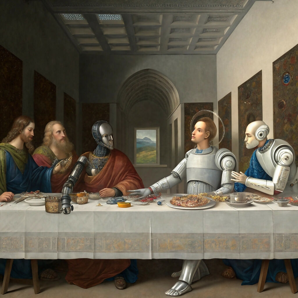 A controversial masterpiece for the modern connoisseur. This exclusive artwork provocatively re-imagines a timeless classical scene by integrating cutting-edge robotics and AI, challenging our perception of the future of humanity and faith. It is a commanding, high-value acquisition for the visionary collector unafraid of dialogue.