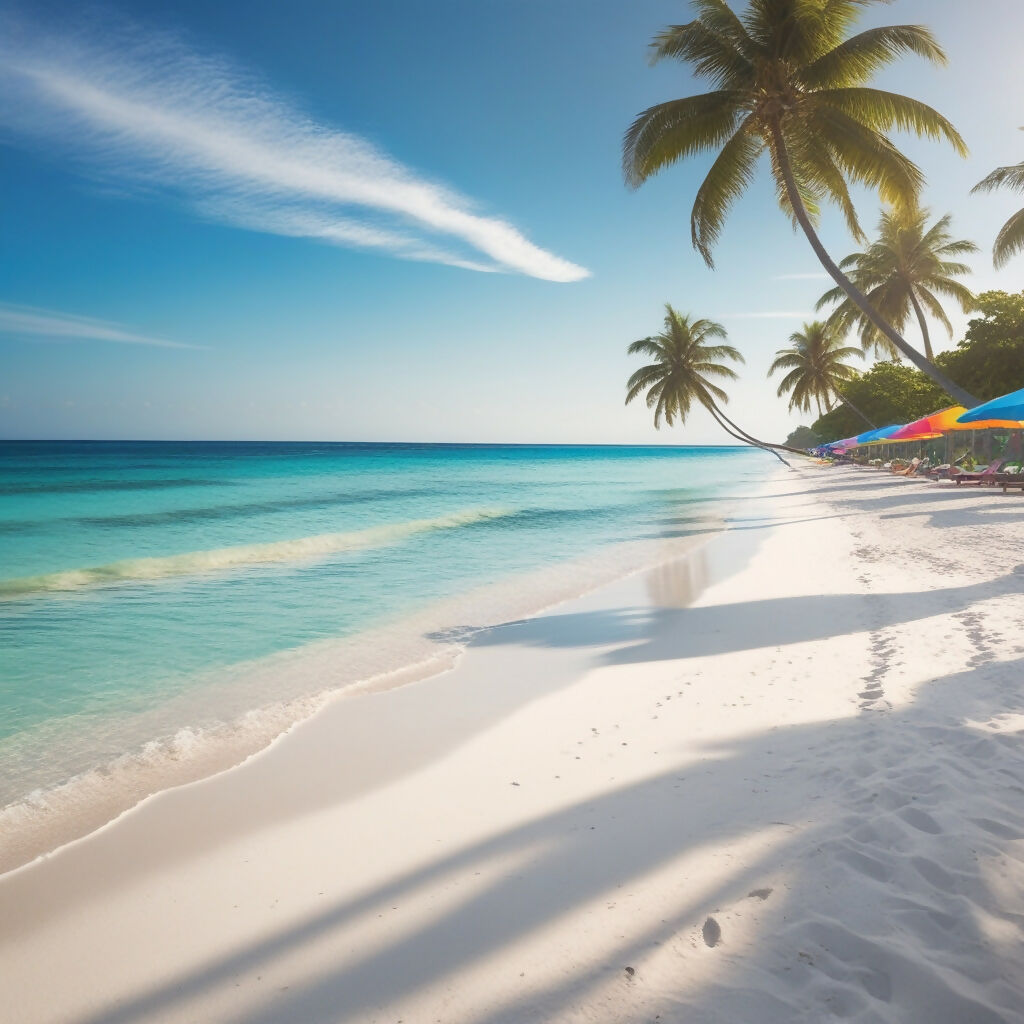 The pristine white sandy beach stretches into the distance, meeting the horizon where the gently rippling turquoise blue ocean sparkles with subtle waves. On the distant beach, majestic palm trees with slender trunks and lush green fronds sway gently in the breeze, while colorful beach umbrellas dot the nearby sand, their vibrant canopies a stark contrast to the serene natural setting. The clear sky above is a radiant blue, with just a few wispy clouds scattered across it, adding depth to the tranquil atmosphere, as the warm sunlight casts a gentle glow over the entire scene.